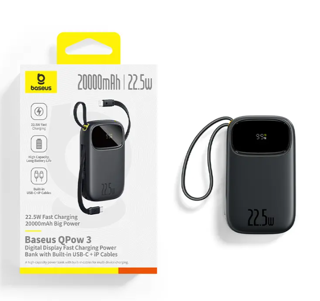 - One of its standout features is the 22.5W fast charging output, supported by multiple protocols such as QC, PD, SCP, FCP, and AFC. This makes it highly versatile and compatible with a wide range of devices, including Android and iOS smartphones. Additionally, the built-in Type-C and Lightning cables provide convenience, eliminating the need to carry extra cables.