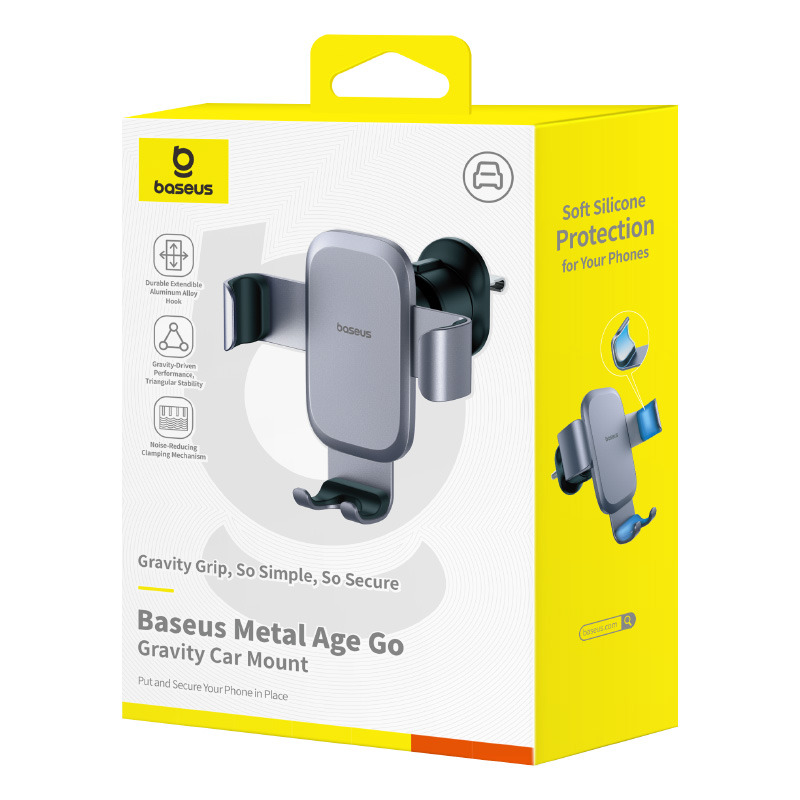 - Built using premium ABS and aluminum alloy, this gravity car mount is crafted to withstand the test of time and frequent use. Whether you’re on a long drive or a daily commute, the Baseus Metal Age II offers stability, durability, and convenience in one compact package.
