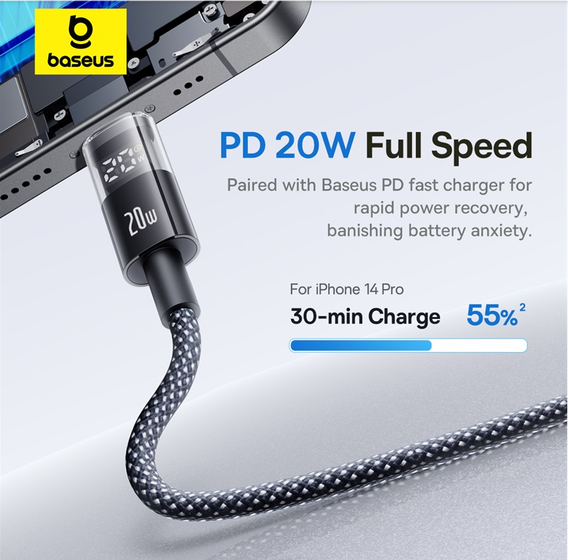 - The Baseus PD 20W Display 2 Fast Charging DataCable is the perfect companion for those who demand speed, durability, and style in one premium accessory. With 20W Power Delivery support, this Type-C to Lightning cable ensures that your devices charge faster and more efficiently, saving you valuable time whether at home, office, or on the go.