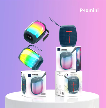 WiWU P40 Mini Thunder Wireless Speaker. The WiWU Thunder P40 mini Bluetooth speaker comes with a color-changing LED color lamp with Microphone. The wiwu speaker is built with a 5.0 wireless Bluetooth connection, a 3000mAh big battery, AUX-INt, a hands-free option, approx. 4-6 hours of playback time, and IPX6 waterproof level. The WiWU P40 speaker supports wireless Bluetooth play, TF card, USB flash drive, and Aux audio input.