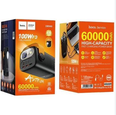 - The Hoco DB160 60000mAh PD100W Power Bank is a powerful and reliable charging solution designed for laptops, smartphones, tablets, and other energy-demanding gadgets. With its massive 60,000mAh capacity, it ensures long-lasting backup power, making it an essential accessory for travel, business, and outdoor activities. Whether you’re on a road trip, camping, or simply need uninterrupted charging during work, this power bank guarantees performance and reliability.